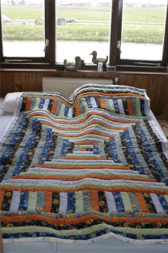 This is supposed to be a logcabin, but I should have organized those fabrics different, since now it looks like an hourglass. I cunningly tried to disguise the wonkiness by pretending I made the bed, but you can still see it…