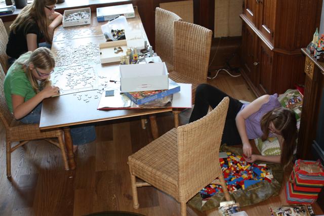I decided to sort out the toys we’d stored away. See if the puzzles still had all the pieces, sort out the Legos (I want to store the Harry Potter sets apart from the rest). The girls were bored and started helping. Lots of fun was had.