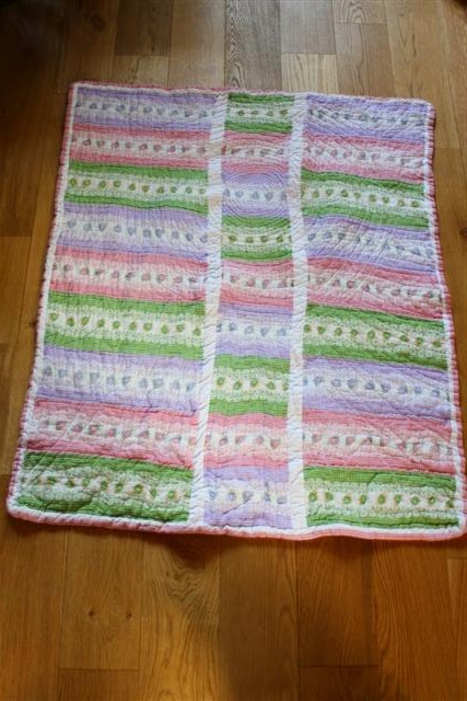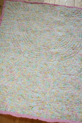 De back is some fabric I had that had exacltly the right colors and the border is made from the pink cover (I had some left) I quilted a sun (circles and beams).