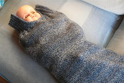 Actually just a sleeping bag with a sack with a collar, meant to keep the littlest of the orphans warm. A perfect project for when I’m too tired to think when knitting, since after the collar it’s just knitting round and round until it’s long enough. I don’t have any real babies in my life to model this right now, so I asked my very first baby, Caroline to help out.I think she’s quite cozy.