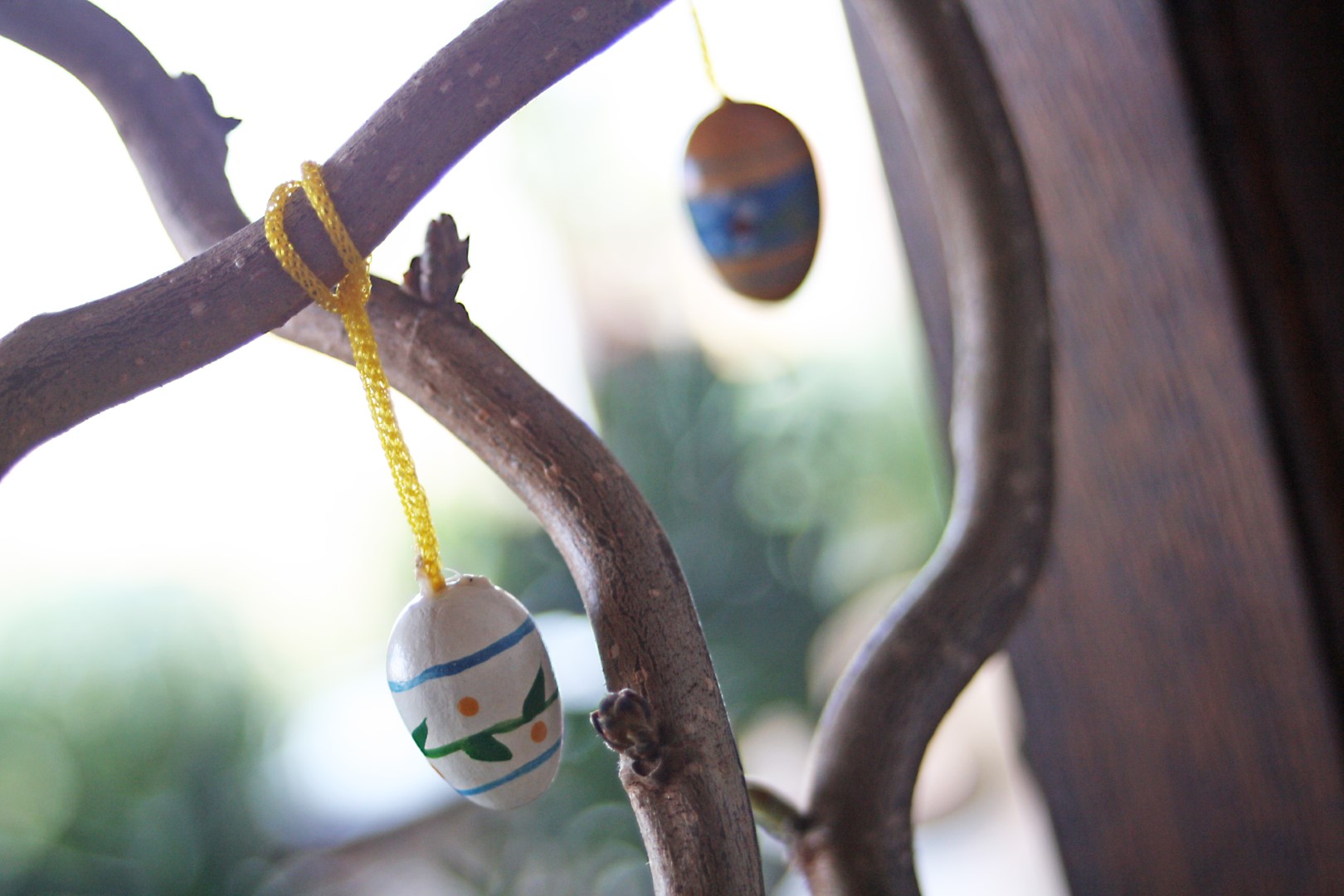 :: thinking that hanging wooden eggs in trees (well, just branches) is actually a silly tradition. But a tradition it is.