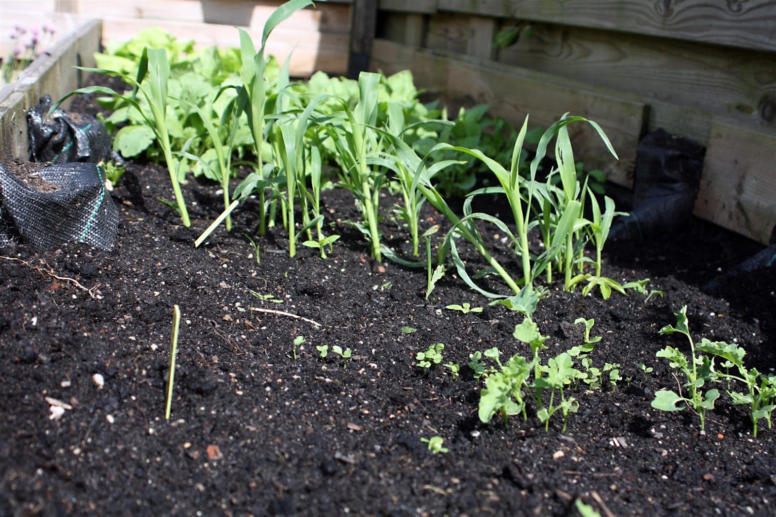 The kale (in the foreground) is still going strong. Maybe this year I will be able to harvest some? In the back: sweetcorn and more radish.