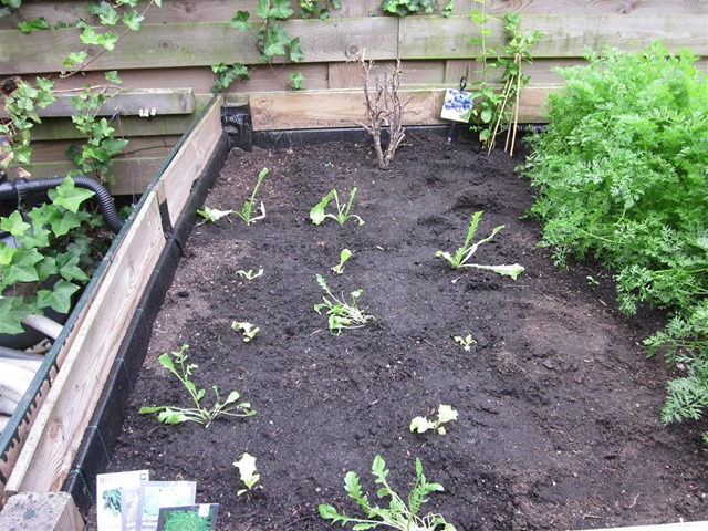There’s also some lettuce, rucola and endives in there, but most of those are in that other empty spot, where the endives that started seeding too early were. I also put a blackcurrant bush and some sunflowers in the back of that bed. The gooseberry was moved there a few weeks ago.