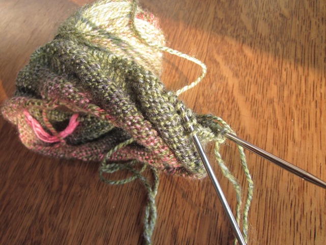 yarn that is too thin for those needles, 100 gram is plenty for a hat, but I don’t really know how much I had, it was scrap yarn. You do have to make sure you have two skeins or balls, one slightly bigger than the other.