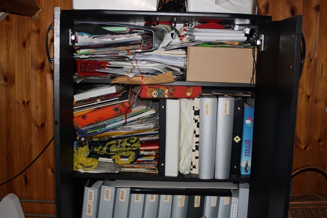 The thing that improved the organization of this still full and cluttered cupboard the most are in the middle of the top shelve. I sorted our papers into sex of these plastic envelopes. One for each of the girls and one for me and husband together (containing reportcards, swimming diploma’s etc.), one for family things (newspaper clippings – these girls have made a few public appearances, notes they wrote, things like that) and one for cards and small things some of my (blogging) friends send me. As I said, it’s still looking cluttered, but I know where to find everything now.