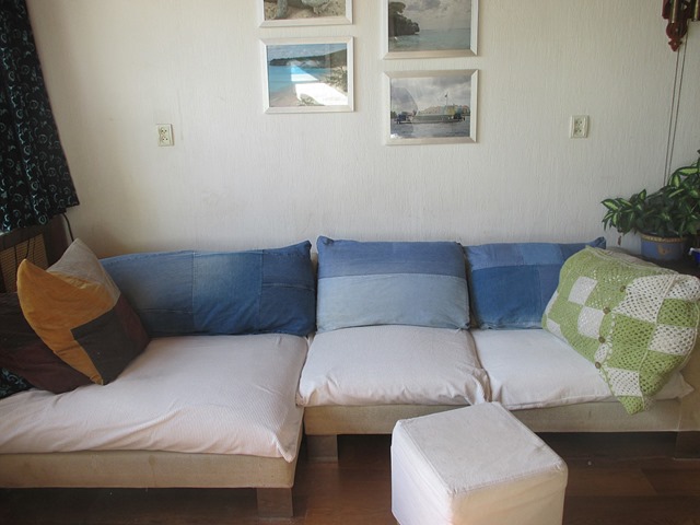But oh those back cushions look so dirty now! They can be washed, but take half a day to dry and you have to put the covers on when they’re still wet to get them on. I hope someday I’ll found more light fabric to match the white, but for now I reused the jeans covers (I cut out the worst parts and sewed them back together).