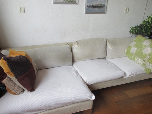 We got it for 100 euro from our neighbors 8 years ago. I was going to say 6 years, but it’s been 8. Oh my, that explains why it’s looking the way it is. But it’s still as comfortable as it was back then. The big cushion got a burn mark and some other stains in it very soon, so I made covers in 2008 (I think, might be earlier). Those have been in heavy use too, especially if you consider both Theo and I are usually working from the couch. We do have an office, but somehow we spent most of our working hours here (and yes, we should probably change that to have a better balance between work and free time, but that’s how we’ve been rolling for years now)