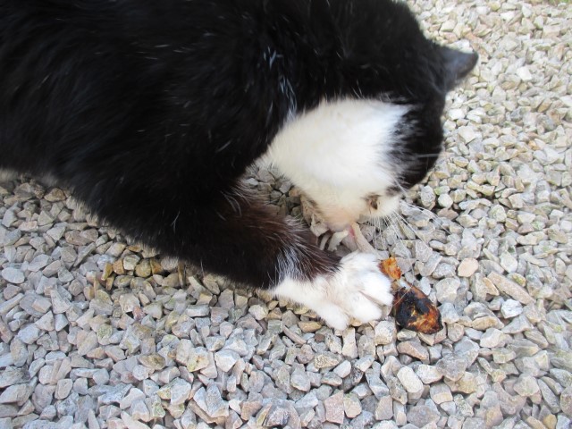 And happily sucking on a chicken bone (yes, sucking, not chewing, he’s nearly toothless)