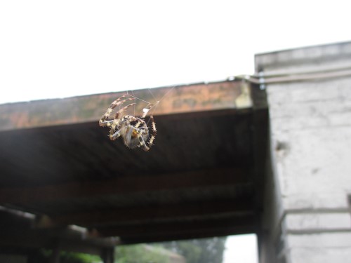 No pictures of the sky on Saturday (it’s just plain grey). This big guy almost landed in my neck because he built a web between the stairs and the containers. And that’s exactly where I had to go.