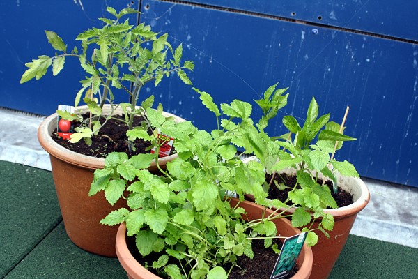 So, no edibles at all? Hmnn, couldn’t let that happen, now could I? Well, there are a few herbs hiding between those other plants (thyme, rosemary, borage, laurel). And we still have the roof terrace so I planted some herbs, tomatoes, peppers and lettuce there.