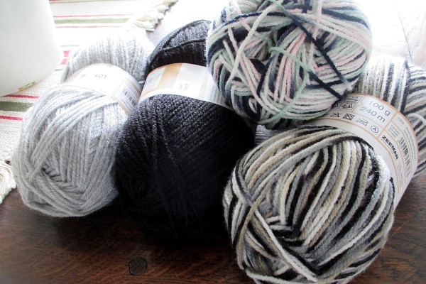 :: the color choices I made for the Mystery Knitalong. Not sure about the third one (the one on top in the picture below). The instructions say it should be variegated or speckled yarn and it can be a crazy accent/pop color with not much in common with the rest. I had a limited choice, limited time and a limited budget, so this was the best I could do. There was another yarn that was much more crazy and popping, but um… too crazy and popping to my taste. It’s hard to see in the pictures, but this one has green and pink in it, which does make it different from the other three.