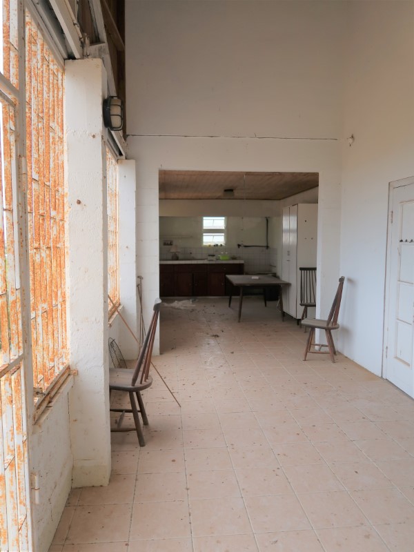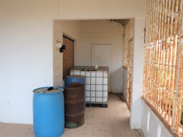This is the side porch, seen from the front. That door in the back goes to the big bathroom. The white thing is a water tank. It was full, so that’s what I’m using to clean. In the end I want all this gone and fill it up with plants and comfortable chairs.