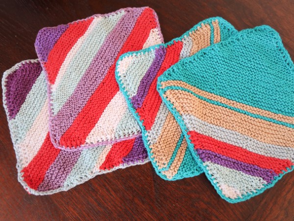 When I picked up knitting a few weeks ago, I forced myself to finish them. But I still didn’t like the color combinations. And I couldn’t get myself to sewing them together as potholders, because I would have either two with nice fronts and ugly backs, or one nice potholder and one ugly.