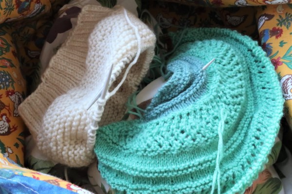 Although all that sitting and resting is good for knitting. I almost finished that hat and I finally got a big part of the Current Cowl done too.
