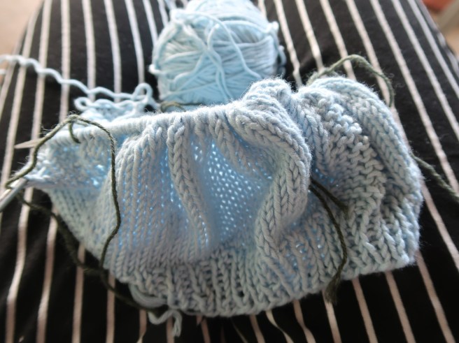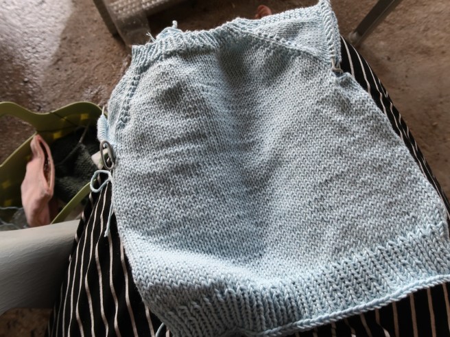 Anyway. We were in the Netherlands shortly after we got the news, so I found myself in the textile shop to buy yarn for this baby the day after we arrived. And it didn’t take me too much time to crank out a cute little hat and some booties. I didn’t use a pattern; just winged it and somehow the construction of the booties worked out right (this is the second time I knit them, first time was three years ago for the grandson).
