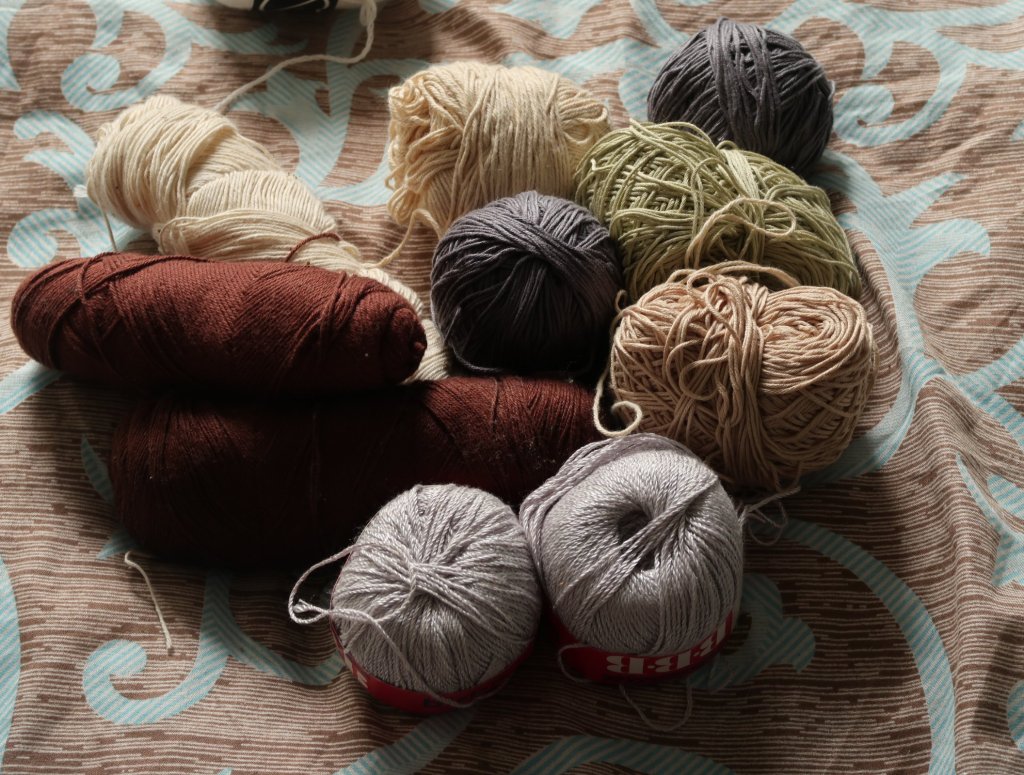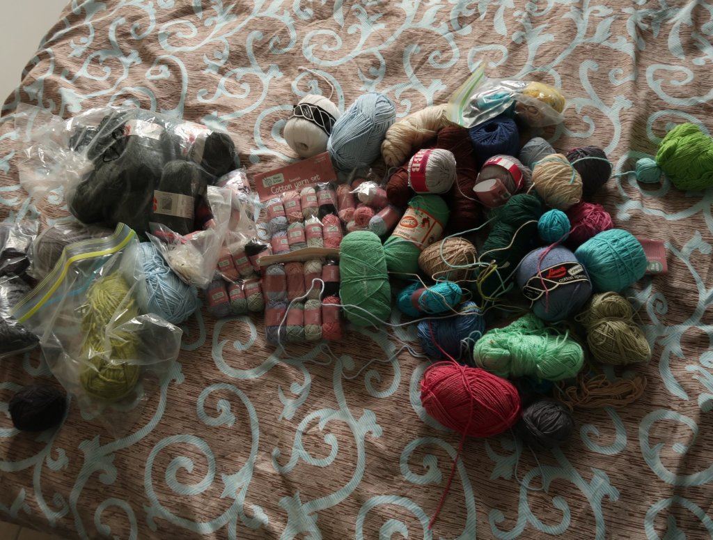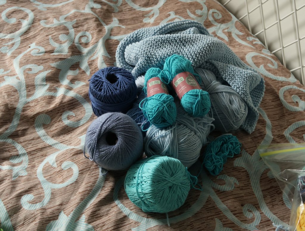 Most of this is cotton. I bought it because it makes so much more sense to use cotton in this heat, but to be honest I don’t have a clue what to do with it, except making dishcloths, potholders and kitchen towels. On the left I have a big bag of a really nice wool/acrylic blend, but I can’t use that for the baby, since both his parents are allergic to wool.