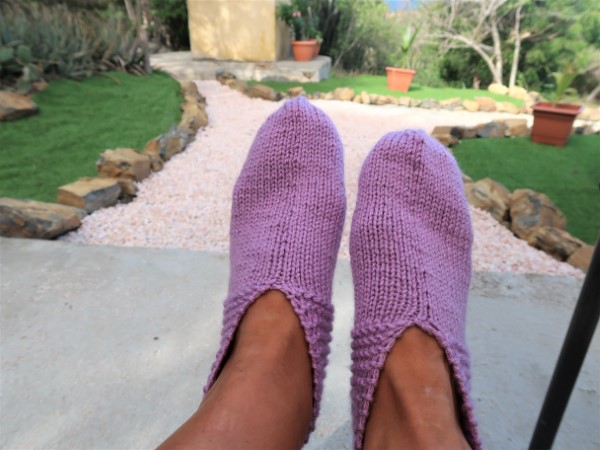 I finished these just in time to take them with me. I have to admit that the color really, really isn’t me. I bought this on the island, and there wasn’t a lot of choices. I do like the color as is, but it doesn’t go with any of my clothes. Still, I’m wearing these almost 24 hours a day (yes, I wear them in bed). We do have heated floors in our Airbnb, but I still get cold feet.