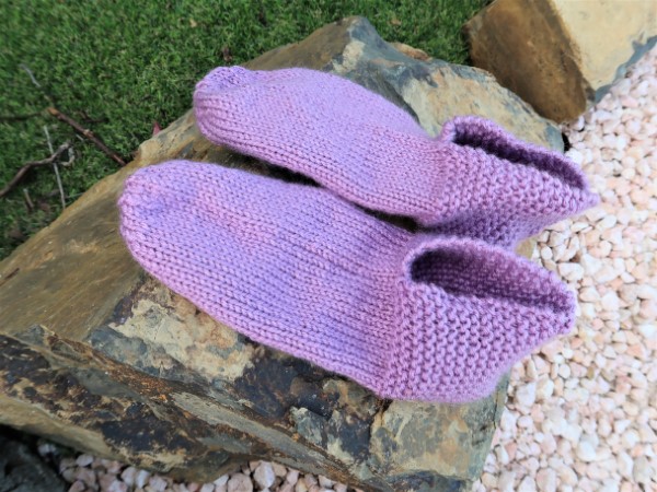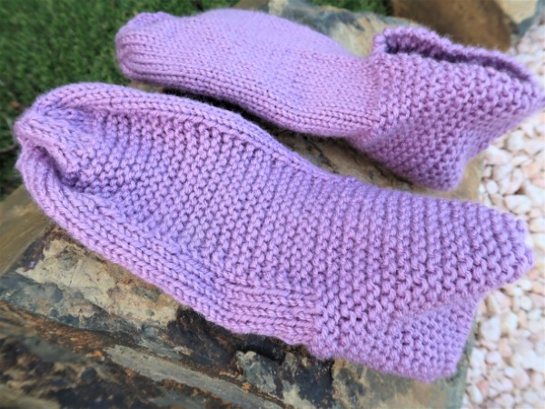 I used a pattern that I had written down in my knitting notebook. I thought Ravelry said it was offline, but I found it here. I love how simple, yet effective it is. I did make one change though. I found previous versions were very slippery, so I decided to knit the whole sole (1/3 of the stitches) in garter stitch, instead of all stockinette after joining in the round. I do feel it works (or maybe I’m just walking more careful these days).