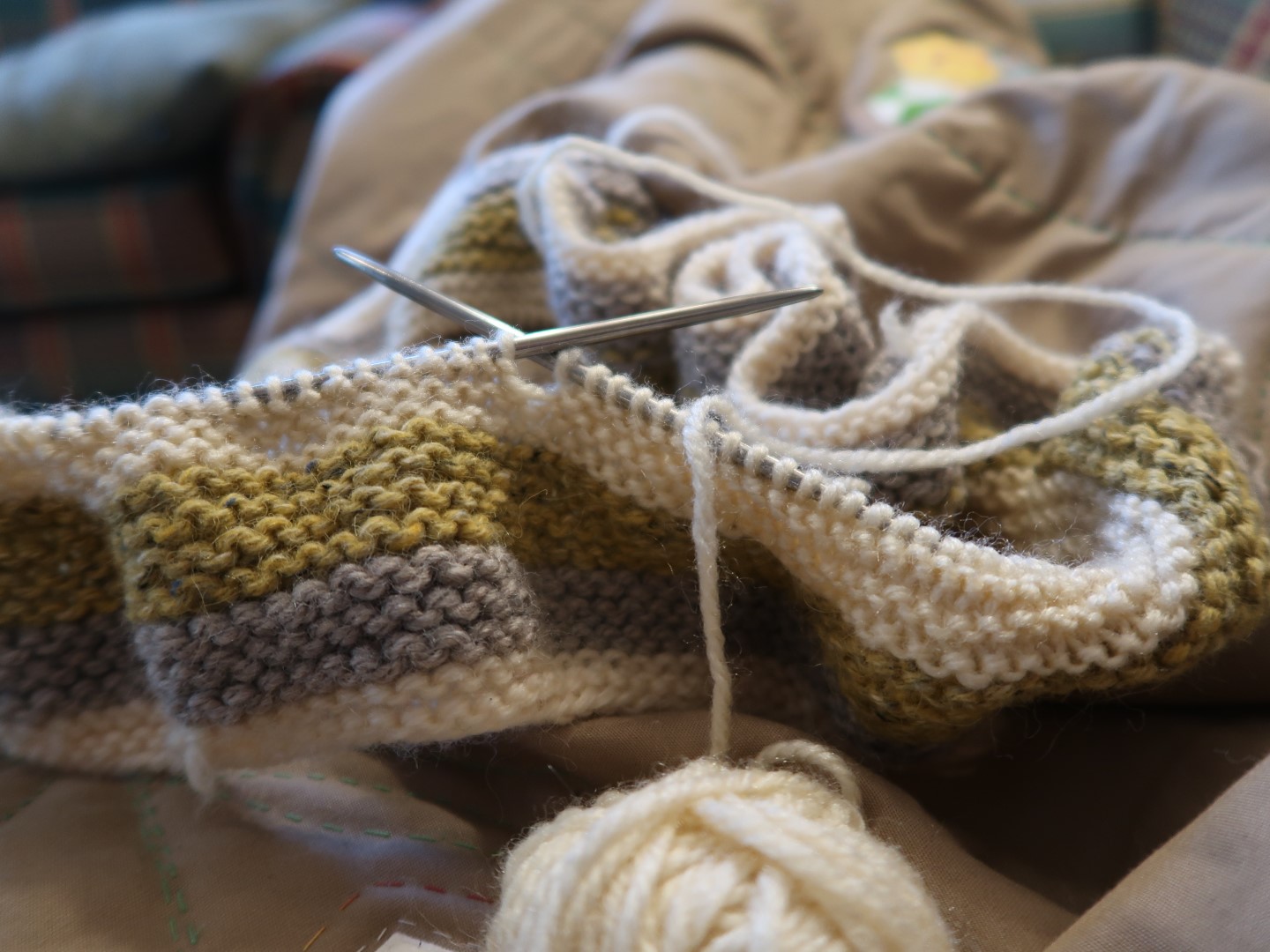 Well, as you can see, I didn’t work on it much, it’s still just a narrow strip. I actually don’t think I even picked it up after I started it, even though we’ve been back there a few times since then. But I knew it was there, waiting for me when I wanted to knit. And somehow, that was comforting. I have been making a few stitches here and there the past few days. Not really committing to it. I’m still too feverish to commit to anything. But it does give me something to do. And who knows… Someday it may actually turn into a real blanket.