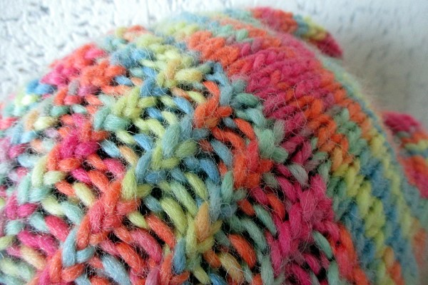 I like this one, though I’d never wear it myself, at least not in these colors. I did love knitting with those bright colors though. The spiral was fun to knit and I may do that again in a different color.