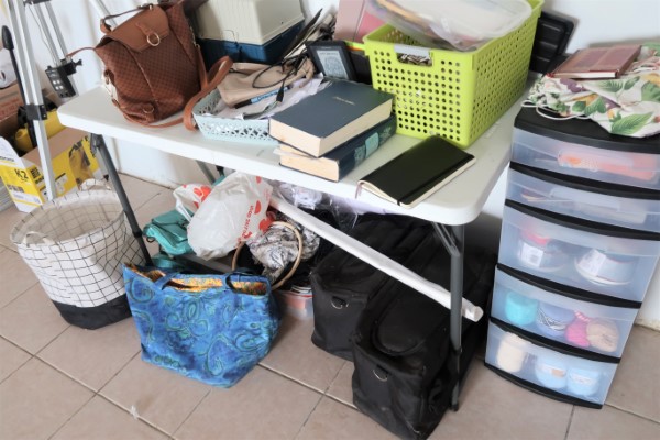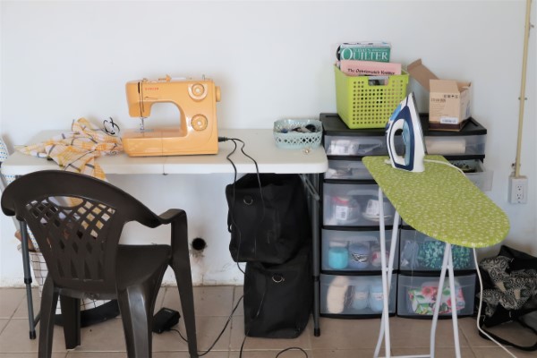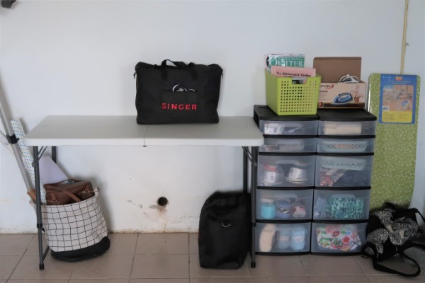 So a few months ago, when I tried to get back to sewing, I put a folding table in the entry room, brought my sewing machines to that spot and… left it like that. Needless to say, it quickly turned into a mess, collecting everything we needed to drop… somewhere.