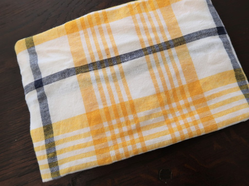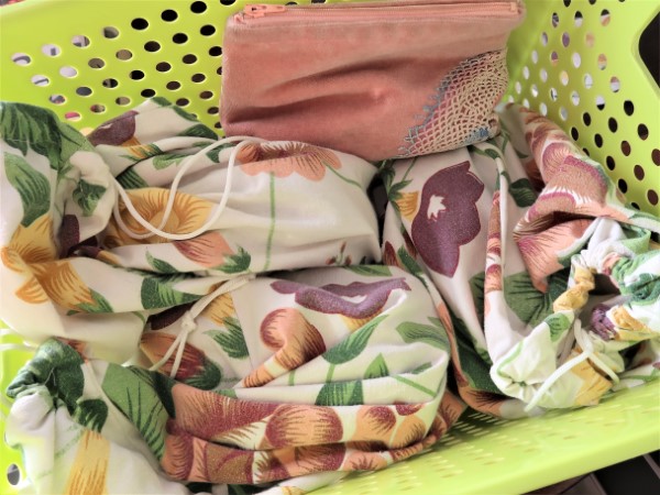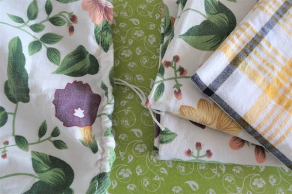 You may recognize that sheet. I already cut it up for another simple project, a few months ago, making three project bags for my knitting. And since I had just the right amount left over after cutting two table cloths roughly the same size as the plaid one, I made a fourth project bag. I was one short after all.