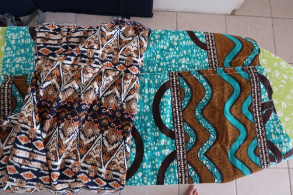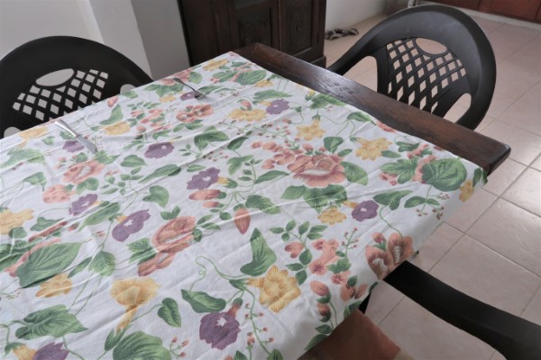 If you recall my older crafty goals (I stopped posting them because there was no progress at all), I’ve mentioned making a table cloth and/or placemats a few times. We have some store-bought placemats, but they are stained and I think they can’t be washed or otherwise cleaned (though I might try to clean them soon, I have an alternative now if they fall apart). In The Netherlands, I used to have a lot of tablecloths and I loved using them, but I got rid of them all, thinking they would blow off the table anyway. Cause that’s what happened in our little apartment. But in this house, we eat in the kitchen and even though we run the ceiling fan when we eat (to keep flies off our food) things stay put. So I can use table cloths after all.