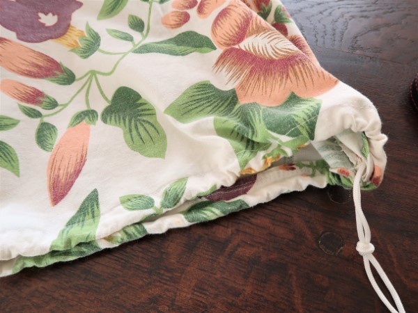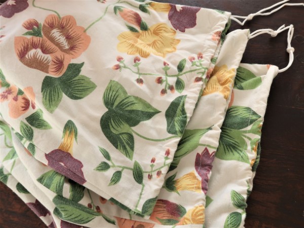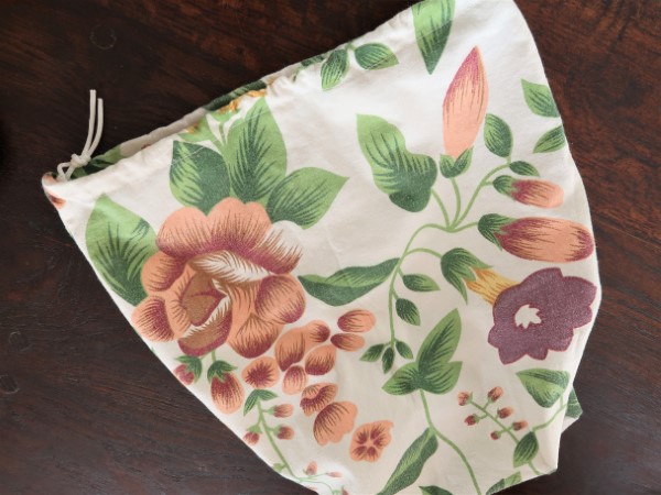 Until last Saturday. I brought home a nice stash of fabric from my trip to the thrift stores (I’ll show all of them next week) and was ready to dive into that, but then I didn’t, because I’m a good girl (sometimes). Some of the fabrics were stained, others were brand new, so they all needed to be washed before cutting into them. Bummer! That didn’t stop me from sewing though. I was determined to sew something, no matter what. Luckily I had this old sheet that I found in the house when we bought it. I already washed it (twice – it was filthy) and it was ready to be cut. I actually had been thinking about using this to make me some simple project bags ever since I found it. So that’s what I did. Three simple drawstring project bags, rectangular bottoms, unlined.