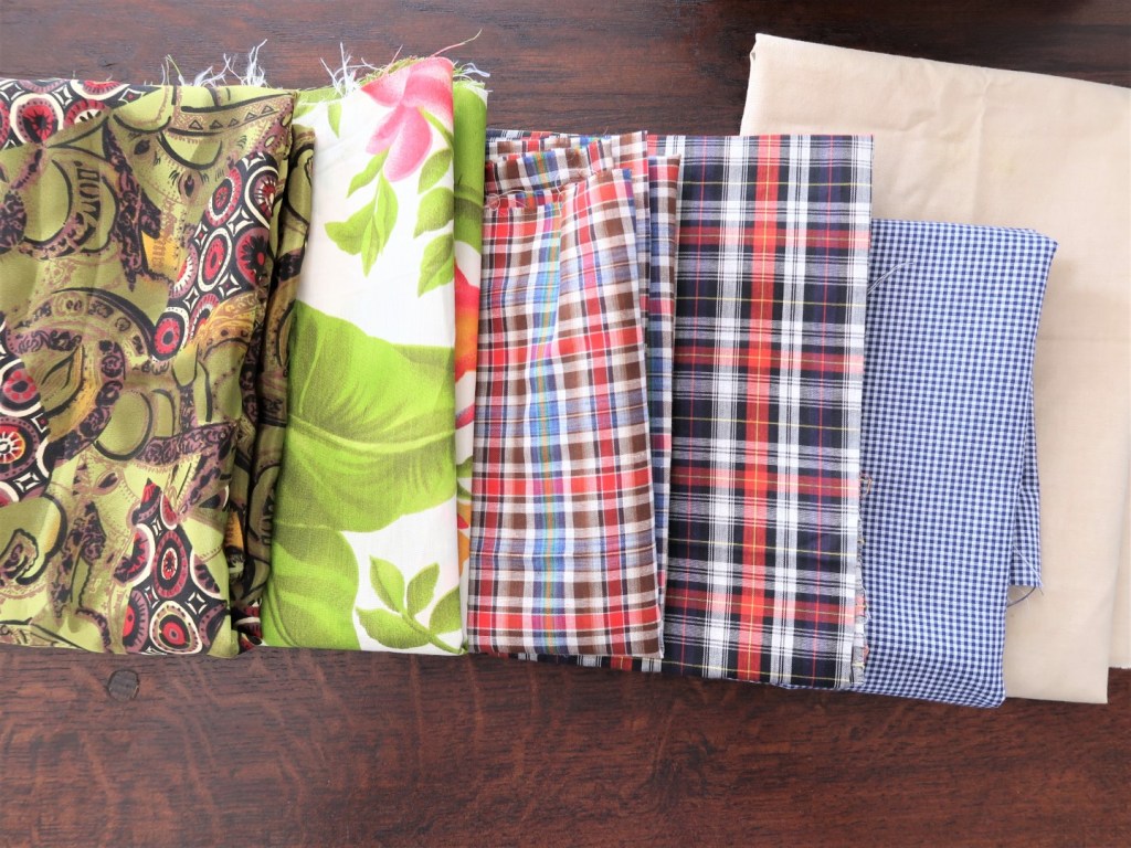 These are synthetic. The left one is enough for a dress, the one next to that is just a little bit and kind of weird feeling, but perfect for a bag or a zip pouch, the plaids could be blouses and the beige will make a nice lining for bags (if I can get the stains out).