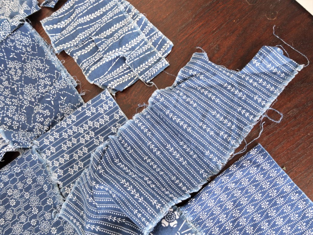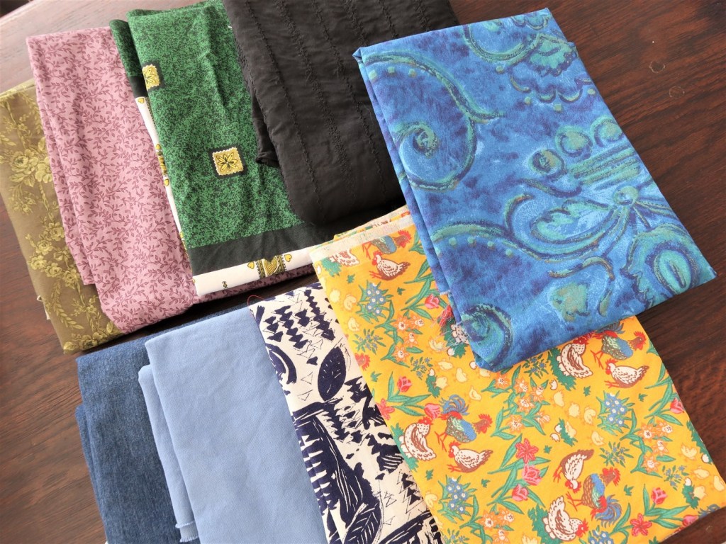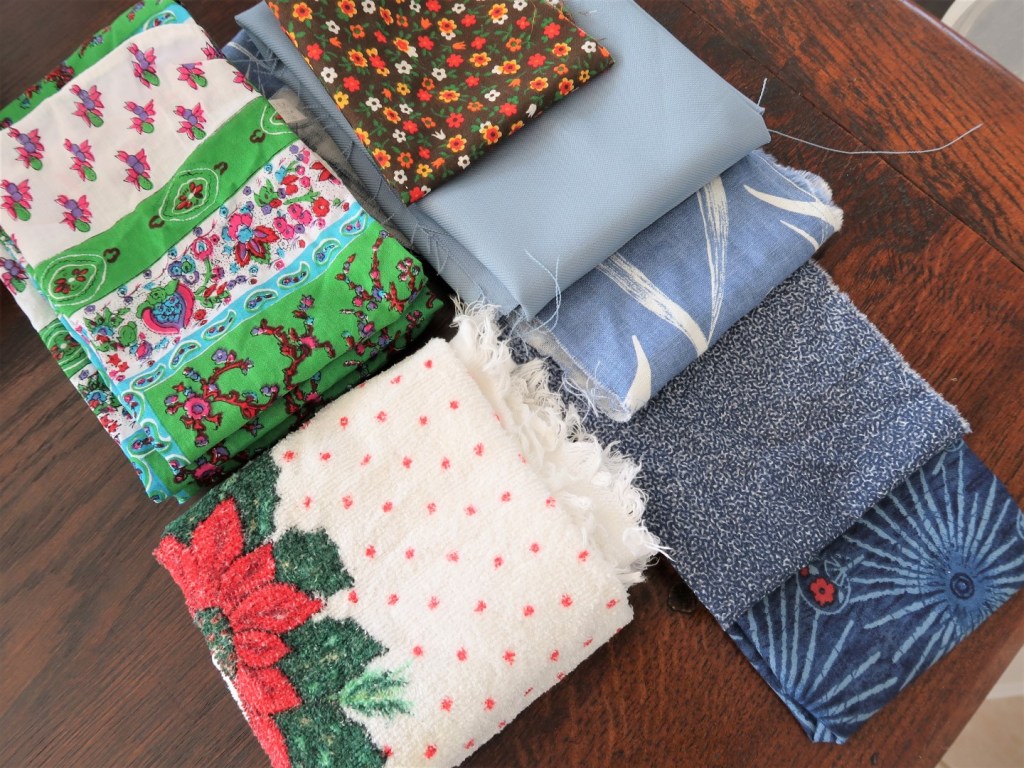 Then there’s this lot. Three bandanas in vibrant colors, a Christmas kitchen towel and a few smaller scraps of fabric. I love the brown flowered one, but it’s really tiny. But I think I can use it somewhere as a pocket or something like that.