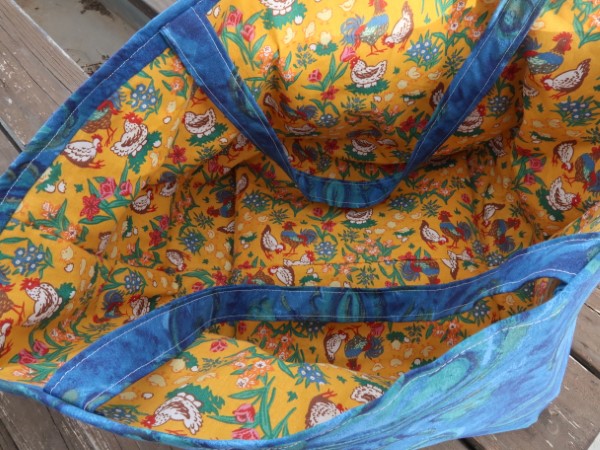 And then I was looking at my stash and had a hard time to decide what fabrics to cut into. I was so happy to finally have fabric again, that I felt it was a really big deal to just start cutting without a pattern. But part of the fun in making bags (at least for me) is just that. Just start cutting, see what I can come up with. I knew I wanted something big to hold my projects and needles, something made from fabric I liked and something that would look nice in pictures. Ahem. I know, that shouldn’t be important, and it isn’t, but I do love pictures of beautiful baskets holding beautiful knitting. But baskets are not made for this climate (salty, moist and hot – they get smelly and moldy), so a bag it will be. Anyway. I kept taking out fabrics, combining them, putting them back and then I decided to drop the wish for beautiful moody pictures (I’d have to make something brownish to mimic a basket but a. I don’t have brown and b. I don’t want brown), and just pick something fun. After all, the beauty of making something yourself from thrifted fabrics is that you can always decide to make something else if you don’t like it (and cut up the discarded bag for another project too). So I took the blue/green I loved for the outside and added the fun chicken print for the inside.