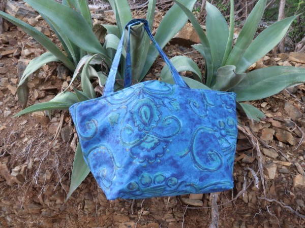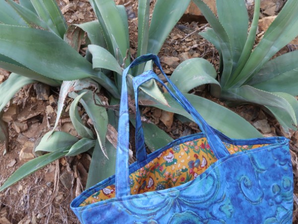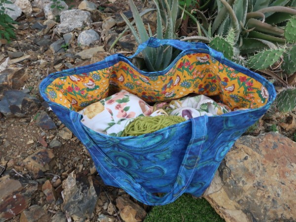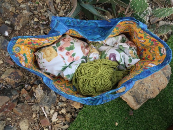 And I’m glad I didn’t. Even though the end result is far from perfect (I would never give it away or sell it – it’s not my best work), it’s actually a fun bag that holds my knitting projects, my needles, my notions and even the book I’m reading. And it doesn’t look too bad in pictures, I think. Mission accomplished.