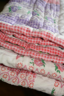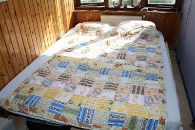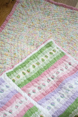 The borders are from a thrifted cotton sheet, the back from a flanel sheet. The quilt top was made from thrifted vintage pillow cases and the filling is an old molton.