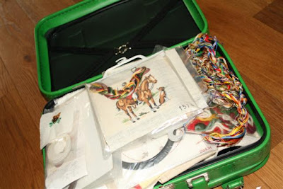 A cute little suitcase full of embroidery patterns, finished embroidery and thread.